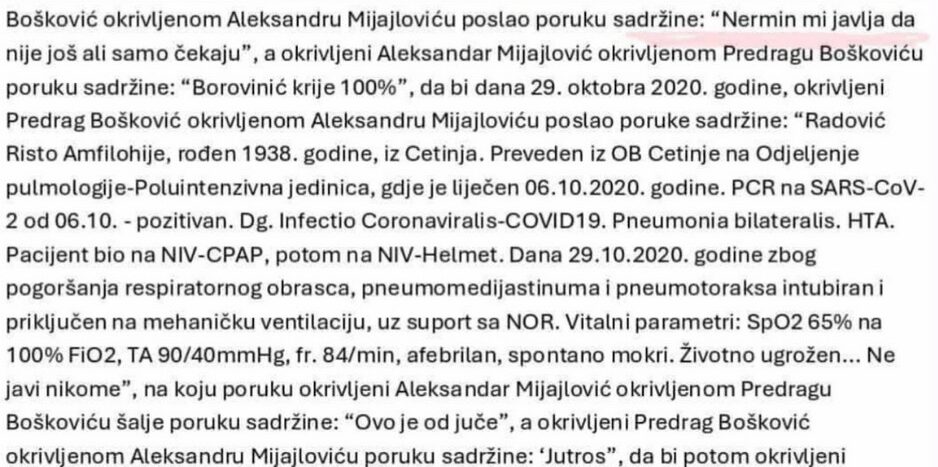 U prepisci se navodi da je Bošković okrivljenom Aleksandru Mijajloviću poslao poruku sadržine: „Nermin mi javlja da nije još ali samo čekaju“, a okrivljeni Aleksandar Mijajlović okrivljenom Predragu Boškoviću poruku sadržine: „Borovinić krije 100%“, da bi 29. oktobra 2020. godine, okrivljeni Bošković okrivljenom Mijajloviću poslao poruke sadržine: „Radović Risto Amfilohije, rođen 1938. godine, iz Cetinja. Preveden iz OB Cetinje na Odjeljenje pulmologije-Poluintenzivna jedinica, gdje je liječen 6. 10. 2020. godine. PCR na SARS-CoV-2 od 6. oktobra pozitivan. Dg. Infectio Coronaviralis-COVID19. Pneumonia bilateralis. HTA. Pacijent bio na NIV-CPAP, potom na NIV-Helmet. Dana 29. oktobra 2020. godine zbog pogoršanja respiratornog obrasca, pneumomedijastinuma i pneumotoraksa intubiran i i priključen na mehaničku ventilaciju… Životno ugrožen… Ne javi nikome“…