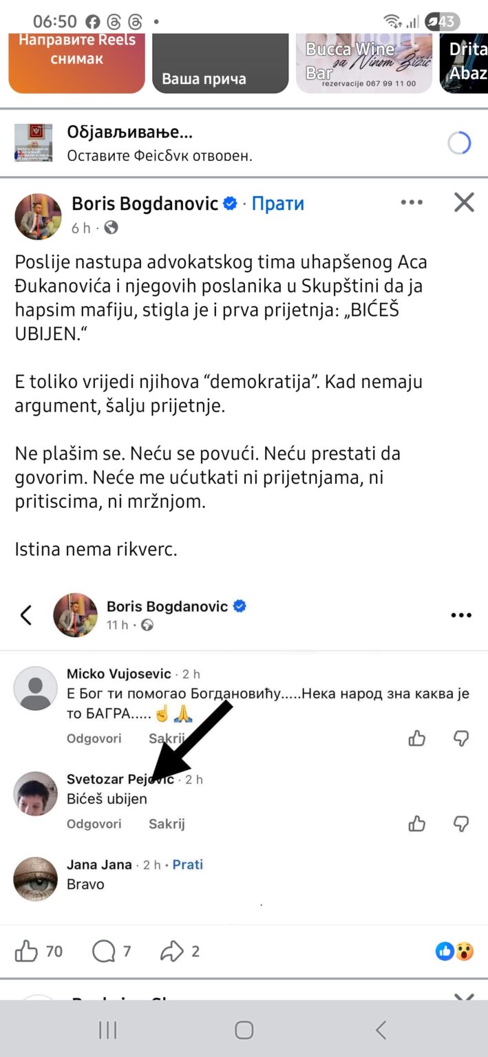 U komentaru ispod njegove objave jedan korisnik društvene mreže napisao je poruku prijeteće sadržine: „Bićeš ubijen“, što je Bogdanović i podijelio uz screenshot kao dokaz prijetnje.