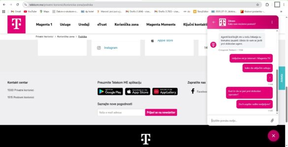 “Crnogorski telekom isključuje uslugu Magenta TV, mobilne telefonije i Interneta nedjeljom (umjesto radnim danima), kad poslovnice tog mobilnog operatera ne rade a ne radi ni kontakt centar a ni podrška. Time su potrošači onemogućeni da otklone blokadu usluge najmanje 24 sata. To posebno utiče na potrošače kojima treba usluga interneta, mobilne telefonije i TV 24/7. Crnogorski telekom ne vrši nadoknadu štete za korisnike koje je oštetio na taj način”, navodi se u pritužbi jednog od korisnika, piše portal Press.